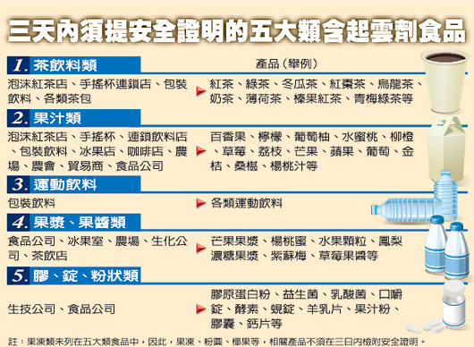 為讓當(dāng)?shù)叵M者安心,臺灣衛(wèi)生主管部門施鐵腕止血,飲料、食品、保健品甚至藥品,只要含起云劑者,下周二凌晨零時起,須提不含塑化劑安全證明。未提交者,將依規(guī)定罰款新臺幣6萬元至30萬元。此外還將采“一行為一罰”,直到業(yè)者提出安全證明,才可重新上架、販賣。除了包裝食品,散裝販賣這類產(chǎn)品如泡沫紅茶店,也須出具安全證明。
