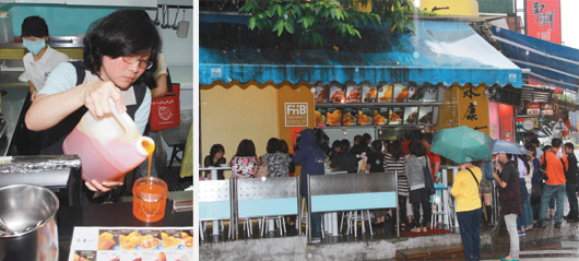 臺北市政府衛(wèi)生局人員(左圖)昨天至永康街,抽查三家知名冰店,沒有發(fā)現(xiàn)業(yè)者使用昱伸的產(chǎn)品,但將業(yè)者沒有明確來源的果醬、果漿等冰品原料攜回檢驗。衛(wèi)生局人員在店內(nèi)抽查時,店外等著吃冰的民眾仍大排長龍(右圖)。 圖片來源:臺灣《聯(lián)合報》