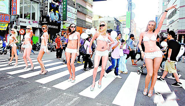 中國臺灣網5月30日消息 據臺灣媒體報道,一家廠商為宣傳新上市美白霜,29日找6位穿著比基尼金發俄羅斯女郎,在人潮眾多的三民、育才北路口利用紅燈時,走上斑馬線扭腰擺臀,一群初中小男生見到衣著單薄的女郎,個個害羞笑開懷;一名牽著女兒的媽媽拿出手機拼命拍照直夸,“這個畫面好美。”