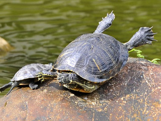 太熱啦!愛曬太陽的烏龜邊曬邊“投降”,就怕四肢碰到灼熱的石頭。圖片來源:臺灣“今日新聞網”