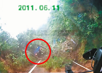 行車紀錄器記錄下當時的畫面,連人帶車墜下200米深谷,還能徒手爬上來,可謂是奇跡。圖片來源:臺灣聯合新聞網