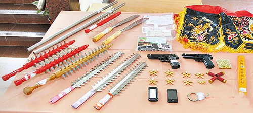 警方掃平四海幫海竹堂口,查扣手槍、狼牙棒、鯊魚劍等兇器。圖片來源:臺灣媒體