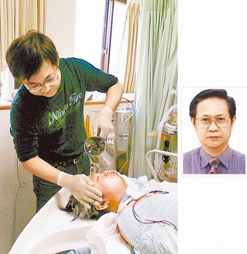 醫(yī)師徐章虎(小圖)插管不當導(dǎo)致廖惠麗變成植物人,其夫李永信每天幫妻子洗頭。圖片來源:臺灣媒體