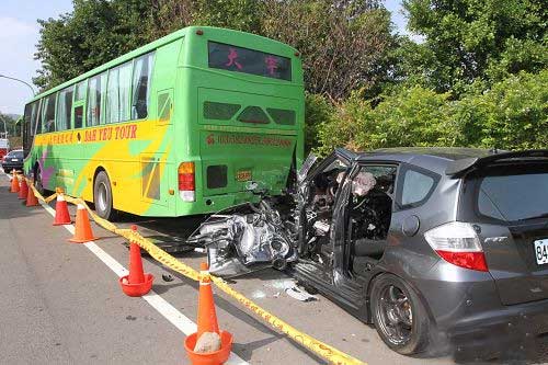 中國臺灣網11月5日消息 據臺灣媒體報道,今天凌晨,臺軍六軍團一名中士周姓炮長(22歲)在卡拉OK飲酒狂歡后,駕駛一輛轎車搭載呂姓(22歲)、彭姓(23歲)等友人,行經新竹縣竹東鎮工業二路上,追撞停放路旁的游覽車車尾,撞擊力道猛烈,17噸重的游覽車遭推離原位偏斜。警方封鎖現場調查中。