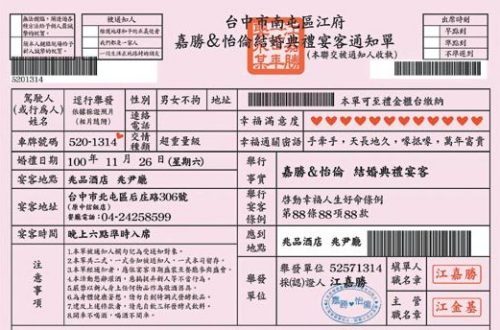 江嘉勝與黃怡倫的喜帖搞kuso,仿交通罰單的顏色與格式,充滿創意。(圖片來源:臺灣《聯合報》)