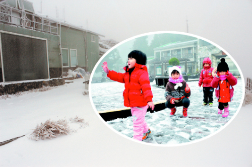 昨天清晨,臺灣降下龍年的第一場瑞雪,小朋友高興地踏雪拍照。(圖片來源于:臺灣《聯合報》)