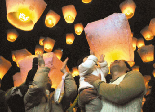 一家三口欣賞天燈美景。(圖片來源于:臺(tái)灣《聯(lián)合報(bào)》)