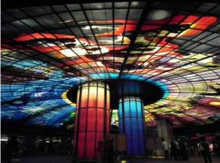 據報道,美麗島站是高雄地鐵最大站,同時也是目前世界上最大的圓形車站。其圓形設計出自日本設計師高松伸之手,以4000多片彩繪玻璃組成,用繽紛的色彩描繪浩瀚宇宙,被命名為“光之穹頂”,是目前世界上最大的單一玻璃公共藝術品。