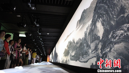 資料圖:2011年8月25日,臺北故宮博物院在“山水合璧——黃公望與富春山居圖新媒體藝術展”中,以數字3D動畫和集錦攝影拼貼的藝術表現形式展示《富春山居圖》靈遠的山水形象,吸引參觀者駐足。中新社發 劉舒凌 攝