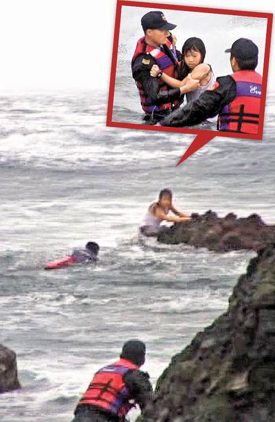 岸巡人員冒6級風浪下海,救援受困礁石的男女學生(圖),女學生獲救后一臉狼狽(小圖)。(圖片來自臺灣媒體)