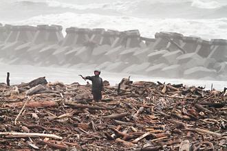 高雄市林園中蕓漁港上周暴雨沖來許多漂流木,“泰利”臺風來襲,昨天傍晚有民眾不顧危險到海邊撿拾漂流木,險象環生。圖片來源:臺灣《聯合報》