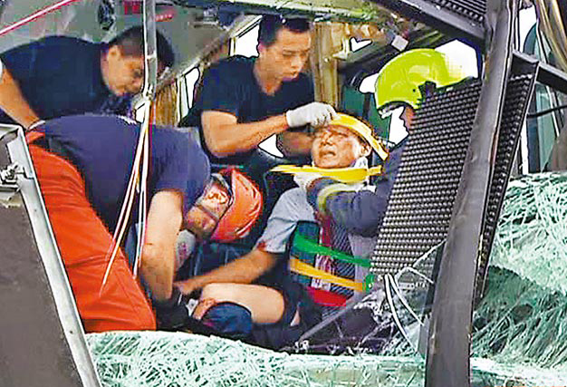 大客車司機被卡在駕駛座上,表情痛苦,警消人員急忙將司機救出送醫。(圖片來自臺媒)