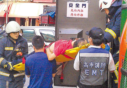 消防人員將昏迷的司機李志明從學生專車后方安全門抬下送醫(yī)。(圖片來自臺媒)