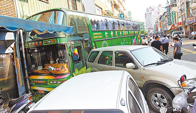 警方調查,臺灣樹德家商學校外包學生專車司機李志明(60歲),昨日早7時許從高雄岡山接38名學生上學,行經一路口右轉后,開始擦撞沿路停放車輛,共撞了5輛汽車及1輛摩托,最后卡在一輛休旅車與鐵皮屋間。