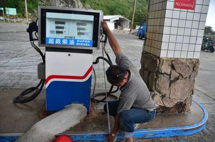 蘭嶼鄉公所將日前被臺風“天秤”重創的唯一加油站進行固定作業,防范加油機再被巨浪沖毀。(圖片來自臺媒)
