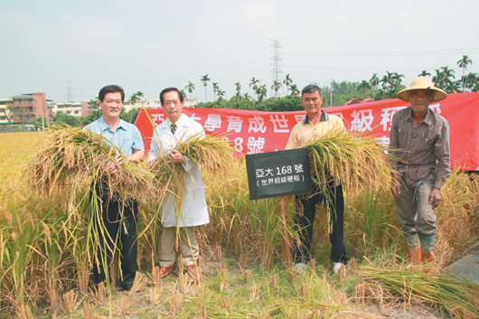 東南網10月10日訊 據臺灣媒體報道,亞洲大學健康學院院長林俊義(左二)費時五年,經過八代育種選拔,從上萬支雜交稻穗中,育成稻稉粗硬、有淡淡玉米清香的“亞大168號超級稉稻”,且收成量大幅提升,農民每公頃可增加近8萬元新臺幣產值。新品系稻米昨天收割,林俊義和農民并肩站在田間,一臉欣喜說,“他有信心,超級稉稻在目前世界各稻種中,產量居冠軍”。