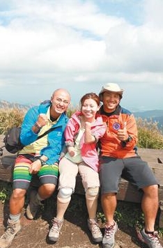 臺(tái)灣體育大學(xué)碩二生吳佳穎(右)、畢業(yè)生顧明翰(左),協(xié)助四肢截肢的生命舞者郭韋齊(中)以義肢登山。圖片來源:臺(tái)灣《聯(lián)合報(bào)》