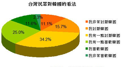 報道說,近年來韓國的商品大舉進入臺灣市場,日常用品、明星藝人到醫(yī)學美容技術,無不充斥在臺灣民眾的生活中,但臺灣創(chuàng)市際市場顧問研究公司所做的調(diào)查顯示,61%臺灣民眾討厭韓國,其中更有11%的民眾表示非常討厭韓國。