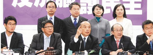 民進黨主席蘇貞昌(前排中)昨天率臺“立法院”黨團三長等人,公開重申反對臺灣旺中并購壹傳媒案,并呼吁馬英九對并購案表態。圖片來源:臺灣《聯合報》