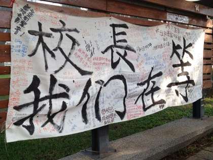 學(xué)生制作的“校長,我們還在等(道歉)”白布條。圖片來自臺媒