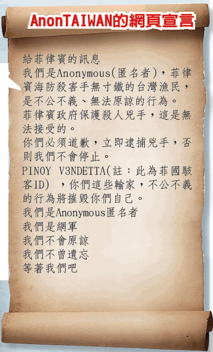 臺灣黑客群AnonTAIWAN的網頁宣言。(圖片來自臺灣《聯合晚報》)