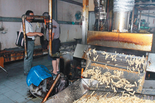 嘉義市衛生局昨天突襲稽查嘉義市百年老店茂州食品工廠,發現環境臟亂、機器卡油垢。圖片來源:臺灣《聯合報》