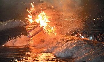 中元祭水燈在熊熊火光中飄向遠方。臺灣《聯合報》圖