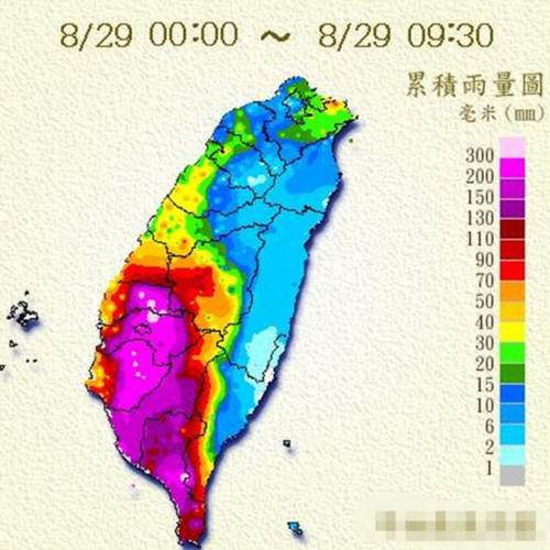 從今天凌晨到9點為止,臺灣多縣市范圍內許多地方的累積降雨都已超過300毫米。(圖片來自臺媒)