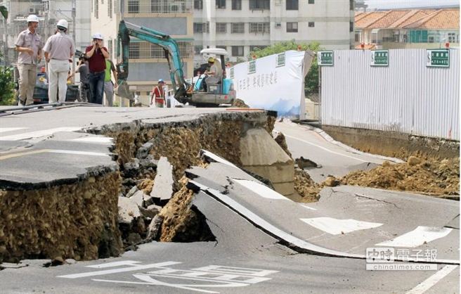馬路嚴重坍塌疑因鄰近工地施工防護不當而造成,事發后工程人員趕緊前往現場勘查并設法善后。(圖片來自臺媒)