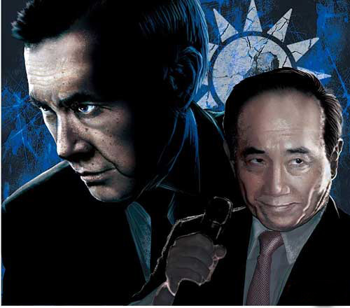 接下來9月13日又以“滅王計劃大曝光”為題作畫。圖中“馬英九”手持雙槍,佩戴“司法正義”臂章,神情冷峻,目指王金平。兩側“江宜樺”、“羅智強”執暗器向王發難。而王手拿國民黨考紀會處理報告作低頭沉思狀,似在考慮后招。