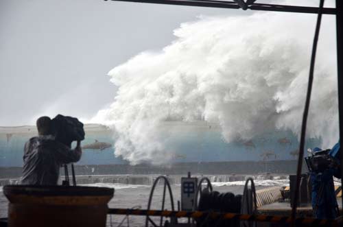 臺風“天兔”來襲,臺東地區(qū)21日清晨風強雨大,海邊掀起滔天巨浪,包括蘭嶼半個島總共6000戶停電,南回公路封閉。臺灣“中央社”圖