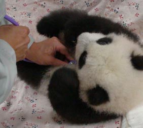 7月6日出生的“圓仔”,現體重快要突破6公斤,比出生時增長約32倍之多,昨天是“圓仔”體檢的日子,獸醫師首先替“圓仔”檢查耳朵,接著進行頸、腋窩和鼠蹊部的淋巴觸診,并觸摸檢查四肢掌部的發展,都沒有異常,隨后的心跳、呼吸聽診也均為正常。