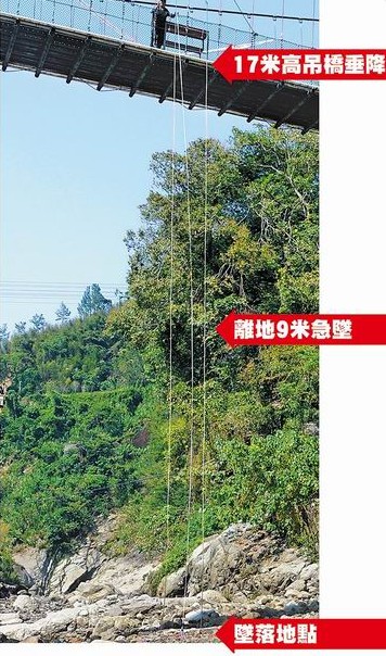 出事的苗栗縣騰龍吊橋高17米,女學(xué)生垂降到一半時(shí),因繩索扣環(huán)松脫摔死。(臺(tái)媒圖)
