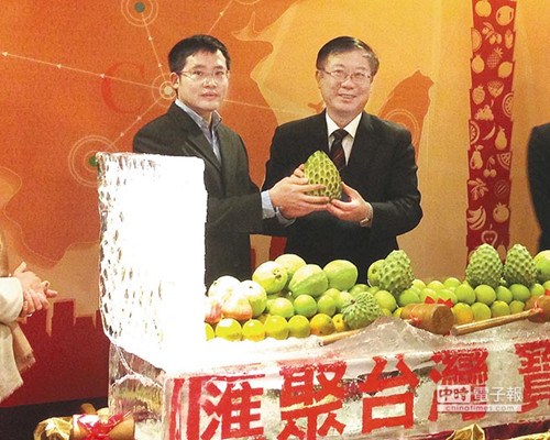 阿里巴巴旗下“聚劃算”總裁張建鋒(左)與臺灣農委會主委陳保基(右)出席“匯聚臺灣之臺灣水果創新C2B模式啟動會”。來源:臺灣《旺報》