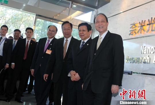 圖為在郭臺銘(右3)等人陪同下,陳德銘(右2)準備入內參觀。 董會峰 攝