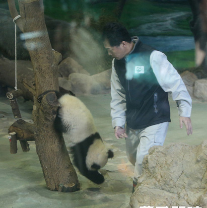 早上8時50分、“上班”時間,圓仔從進入熊貓舍的小門探出頭來,但隨即縮回去,保育員用紅色尼龍繩引誘“圓仔”,它還是不肯出來。早上9時2分,保育員折騰良久,終于把她抱出場放在棲架上,小家伙馬上跳下來要跟保育員回去,因此摔下棲架來。保育員之后在展場繞了1圈,“圓仔”也跟緊追著他后邊跑,保育員只好把“圓仔”放上稍高的棲架,然后趕快跑掉。