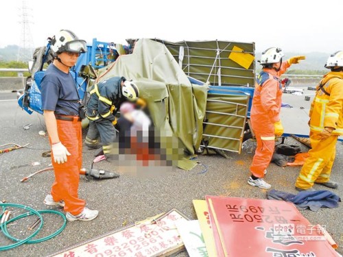 據臺灣《中國時報》報道,臺灣新北市傳統音樂發展協會會員8人共乘小貨車赴臺南市拍劇,途中車后輪突然爆胎,貨車失控擦撞中央分隔島,在空中翻轉360度后重重墜落,車上7人彈出車外,造成2死5重傷1輕傷;此案正由公路警察處理。