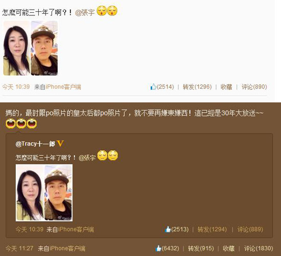 5日是兩人戀愛(ài)30年的紀(jì)念日,蕭十一郎在微博分享了二人的“合照”,相似表情和角度很逗趣。她說(shuō):“怎么可能三十年了啊?!”張宇隨后也轉(zhuǎn)發(fā)妻子的微博,驚訝的說(shuō),“最討厭po照片的皇太后(指蕭十一郎)都po照片了,就不要再嫌?xùn)|嫌西!這已經(jīng)是30年大放送”,稱老婆為“皇太后”。盡管網(wǎng)友笑稱是“妻管嚴(yán)”,但也在微博發(fā)起“有一種愛(ài)情叫張宇十一郎”話題,紛紛表示祝福。(中國(guó)臺(tái)灣網(wǎng) 何建峰)