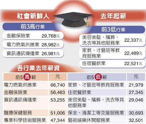 若以行業(yè)別來(lái)看,最有行情的社會(huì)新鮮人,首推金融保險(xiǎn)業(yè),平均起薪29768元,電力及燃?xì)夤⿷?yīng)業(yè)居次,28982元,服務(wù)業(yè)的起薪相對(duì)則較低,僅22K、23K。