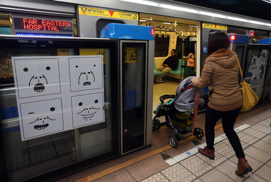 臺北地鐵站臺門印插畫陪乘客等車(圖)