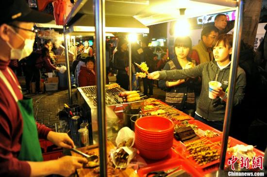 資料圖:通過自由行來到臺灣的大陸女孩正在臺北士林夜市品嘗美食。中新社發 王東明 攝