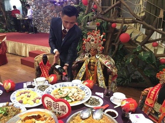 據臺灣《聯合報》報道,臺北花卉村昨晚有場特別的婚禮,新人請來20尊神像當見證,還為眾神準備2桌“酒席”。