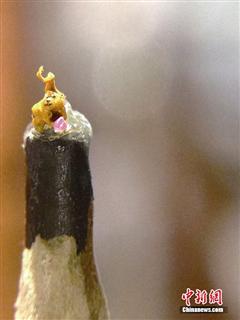 觀賞這個“世界最小”猴子,必須透過放大鏡,才能一窺全貌,可說是代表陳逢顯近40年來的毫芒雕刻得意作品“追求一毫米”。