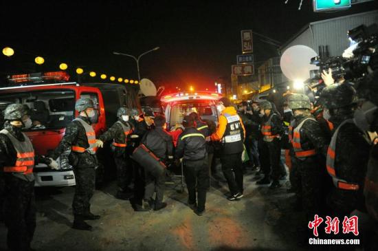 2月6日淩晨3時(shí)57分許,臺(tái)灣高雄發(fā)生里氏規(guī)模6.4級(jí)地震。臺(tái)南市永康區(qū)維冠金龍大樓倒塌,當(dāng)晚,搜救工作持續(xù)進(jìn)行,搜救隊(duì)在黑夜中不放棄任何一絲希望。圖為晚上9時(shí)15分左右,有傷者從倒塌大樓中救出。中新社記者 譚達(dá)明 攝