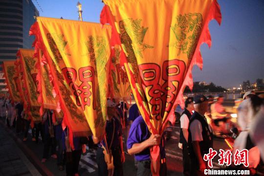 福建東山關(guān)帝神像16日下午從澎湖運(yùn)抵高雄,來自全臺(tái)各地的21家關(guān)帝神廟數(shù)千信眾到高雄香蕉碼頭接駕,晚上舉行踩街活動(dòng)。 徐德金 攝