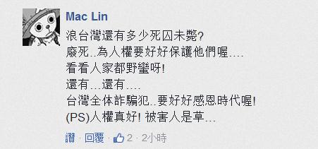 還有臺灣網友借機諷刺稱,“浪臺灣還有多少死囚未斃? 廢死..為人權要好好保護他們喔…. 看看人家都‘野蠻’呀! 還有…還有…. 臺灣全體詐騙犯..要好好感恩時代喔! (PS)人權真好! 被害人是草…