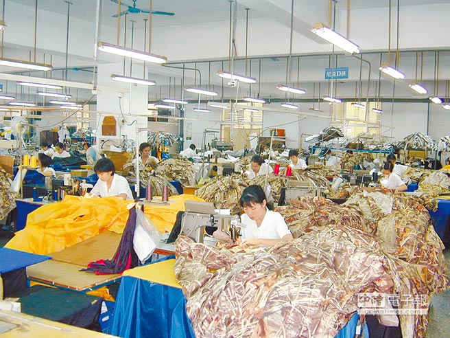 “一例一休”新規通過,傳統產業為避免成本增加,只好盡量不要加班,圖為風雨衣生產工廠員工忙碌趕工。(圖片來源:臺灣《中時電子報》)