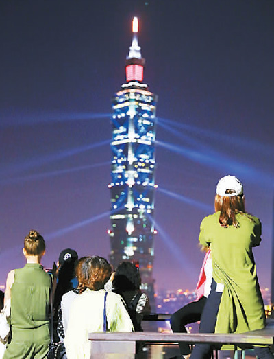 為迎接新年,繼跨年夜推出煙火燈光秀后,臺北101大樓從元旦起至1月12日,晚間7時至9時30分,每隔半小時有燈光秀展演,共有9種不同的燈光模式。1月2日是元旦3天假期末尾,臺灣民眾紛紛把握最后的閑暇出游,不少人登頂臺北象山與炫目的臺北101大樓合影。本報記者 張 盼攝