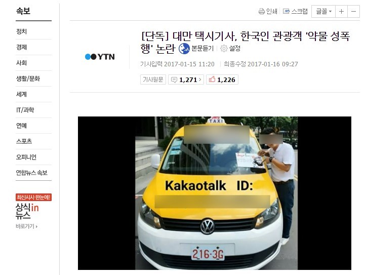 韓國《JTBC》電視臺主播稱,“在臺灣旅游的20多歲女大生,遭到計程車司機性侵,她們在喝了司機給的養樂多后,失去意識”;《YTN》主播說,“在臺灣旅游的兩名韓國女性,遭到當地計程車司機性侵”;《SBS》電視臺也請來記者和主播討論該新聞。
