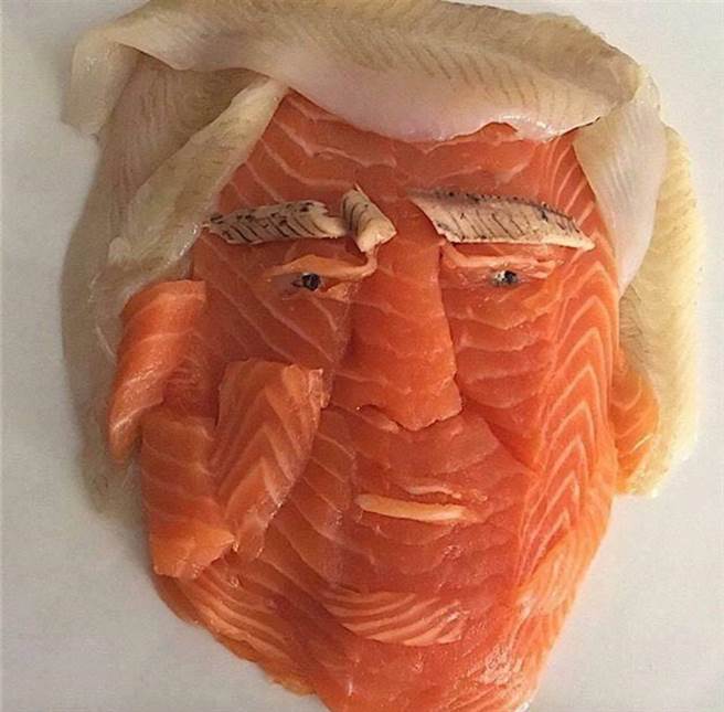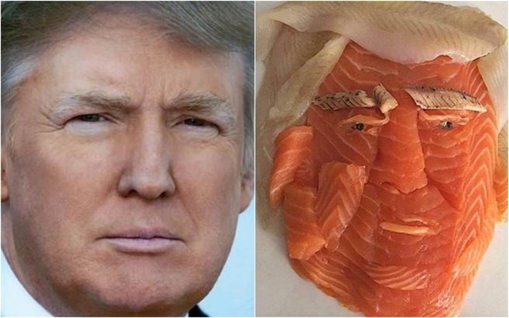 報道稱,一名網友于臉書“爆廢公社”上傳一張相片,只見多片鮭魚生魚片堆棧在一起,上面點綴著頭發、眉毛、眼睛及嘴唇,激似剛上任的美國總統特朗普,而原發者還在文中寫道:“川普是你!?(臺灣將‘特朗普’譯作‘川普’)”,令不少網友笑翻。